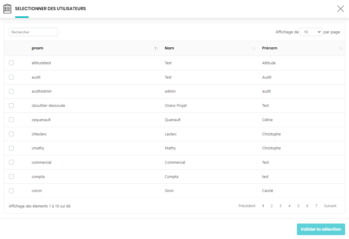 Vous pouvez cocher plusieurs utilisateurs pour les affecter en même temps, vous pouvez rechercher par leurs identifiants, leurs noms, ou leurs prénoms. Une fois votre choix fait, vous pouvez valider avec le bouton bleu « Valider la sélection »