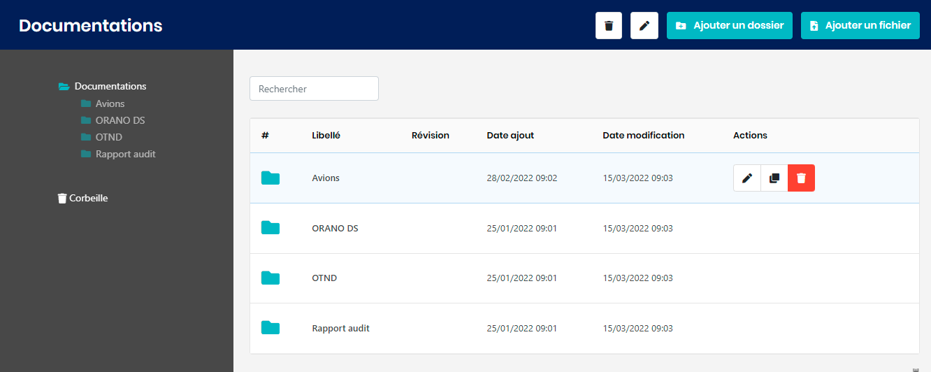 Dans la fenêtre ci-dessous, l’utilisateur peut naviguer et rechercher des documents grâce au moteur de recherche situé en haut à gauche de la fenêtre. Sur cette représentation de l’arborescence l’utilisateur dispose d’informations sur les documents, tels que le libellé, le numéro de révision, la date d’ajout, de modification, ainsi que les actions possibles.