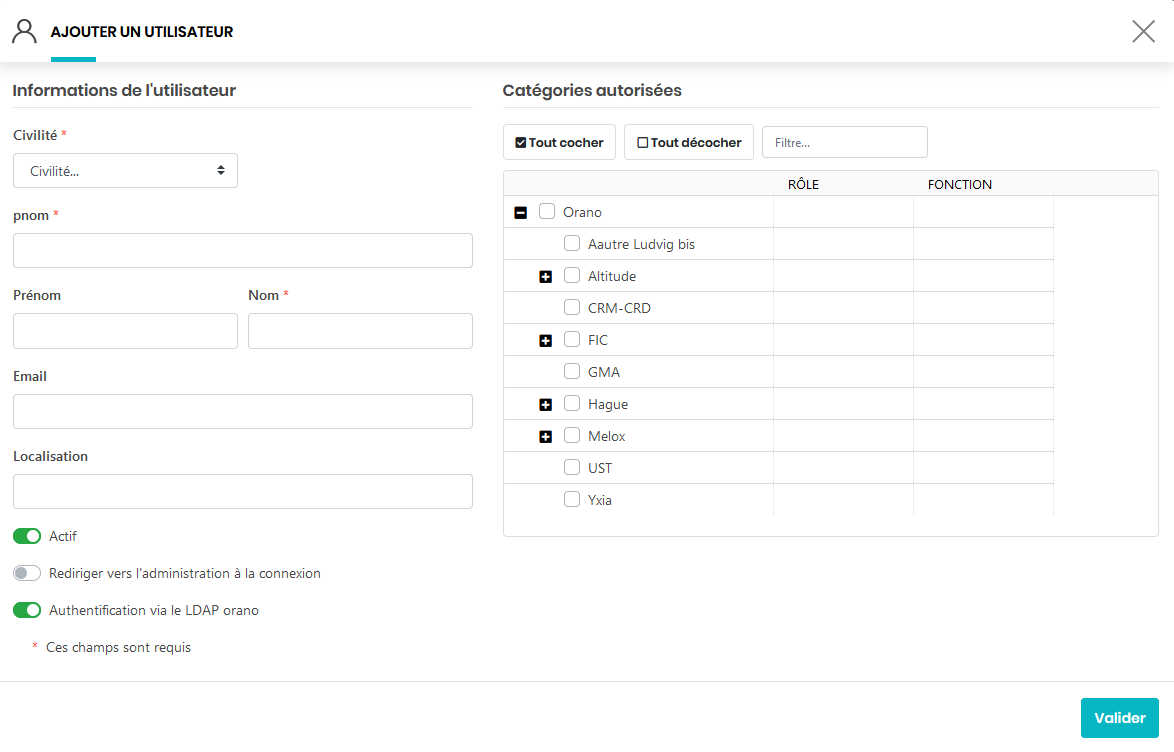 - Choisissez les catégories auxquelles l’utilisateur appartiendra ainsi que le rôle et la fonction qu’il aura dans chacune des catégories choisies