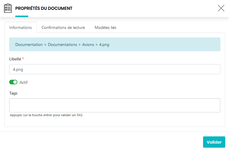 Dans cette fenêtre vous pouvez modifier le libellé du document (par défaut c’est le nom du fichier qui est utilisé).