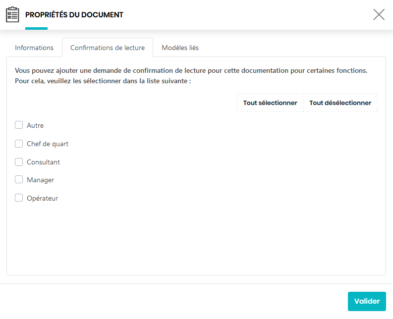Vous pouvez sélectionner les rôles d’utilisateurs pour lesquels une confirmation de lecture sera demandée.