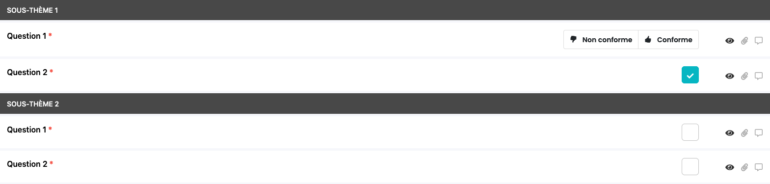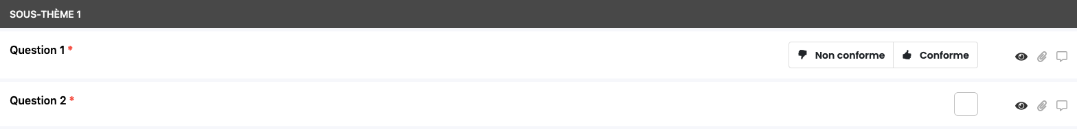 Les icônes de règles d’affichage vous indiquent les Questions impactées. Vous pouvez accéder aux modifications en cliquant dessus, ou visualiser les règles définies en survolant chaque icône.