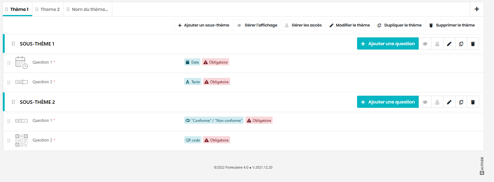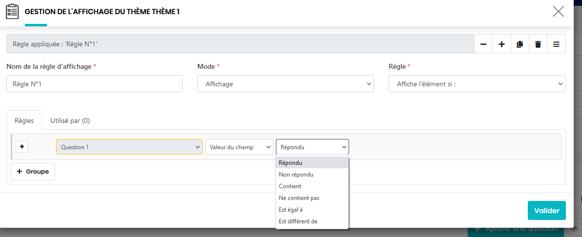 Vous pouvez conditionner l’affichage de différents éléments en ajoutant des règles au moyen de boutons spécifiques. Vous pouvez définir des règles à l’aide de 1 ou plusieurs paramètres.Les règles peuvent être stockées et réutilisées pour d’autres éléments d’un même formulaire La suppression d’une règle est répercutée pour l’ensemble des questions sur laquelle elle s’applique.
