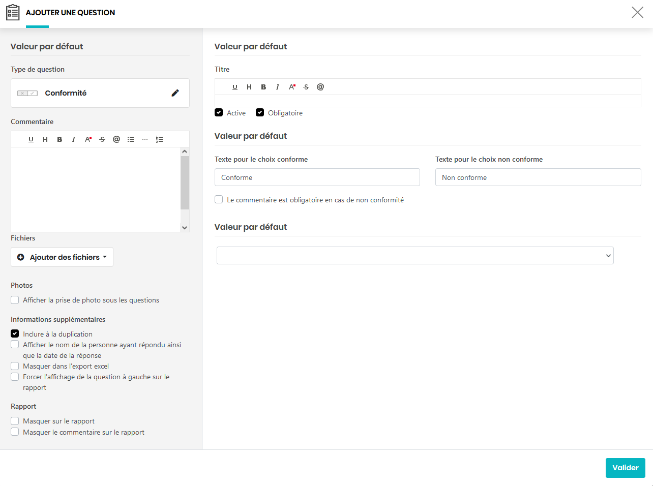 Interface d’ajout de la question conformité Une question conformité est une question à deux choix dont une qui est conforme et l’autre non. Vous pouvez également choisir une valeur par défaut