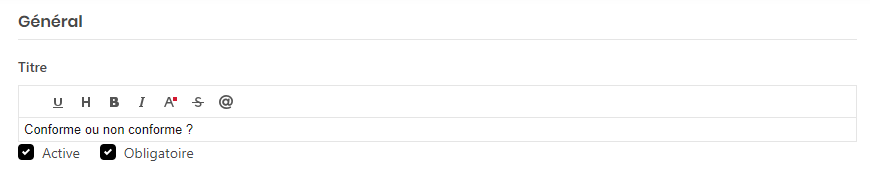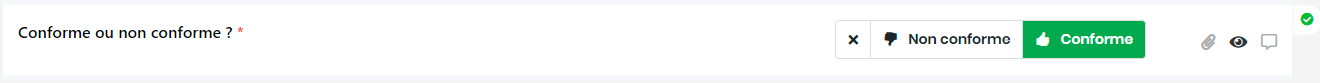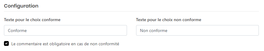 Les questions de type Conformité appellent une réponse parmi deux choix possibles. Vous pouvez définir le titre, laisser les intitulés par défaut, ou les remplacer. Vous pouvez définir qu’un commentaire est obligatoire.