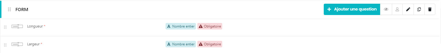 Dans un premier temps, créez deux types de questions texte libre « Longueur » et « Surface » et les configurer en mode numérique entier par exemple.