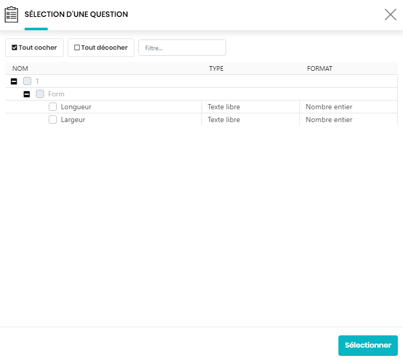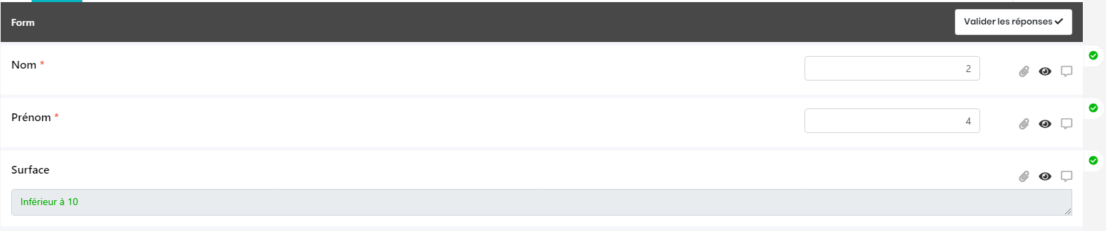 Les questions de type Formule, permettent de réaliser des calculs, ou des concaténations en utilisant des valeurs ou des chaînes de caractères issues de champs précédemment complétés dans le formulaire.