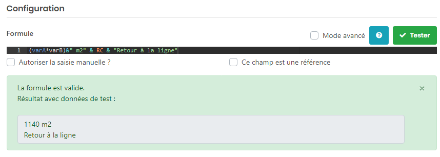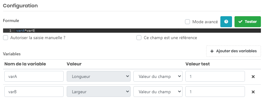 Saisissez votre formule pour calculer la surface dans le champs de saisie de la formule : varA*varB