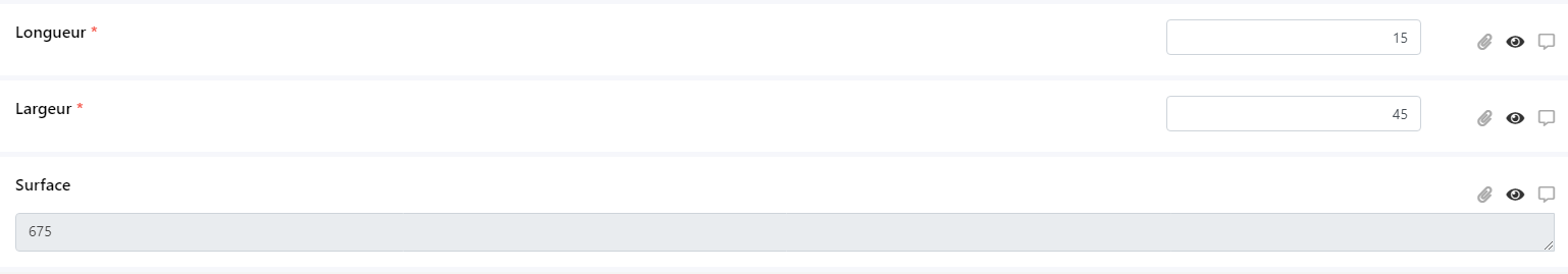Ajoutez une nouvelle question de type formule, ajoutez les deux variables « Longueur » et « Surface » en cliquant sur le bouton , ils seront nommés par défaut var1 et var2