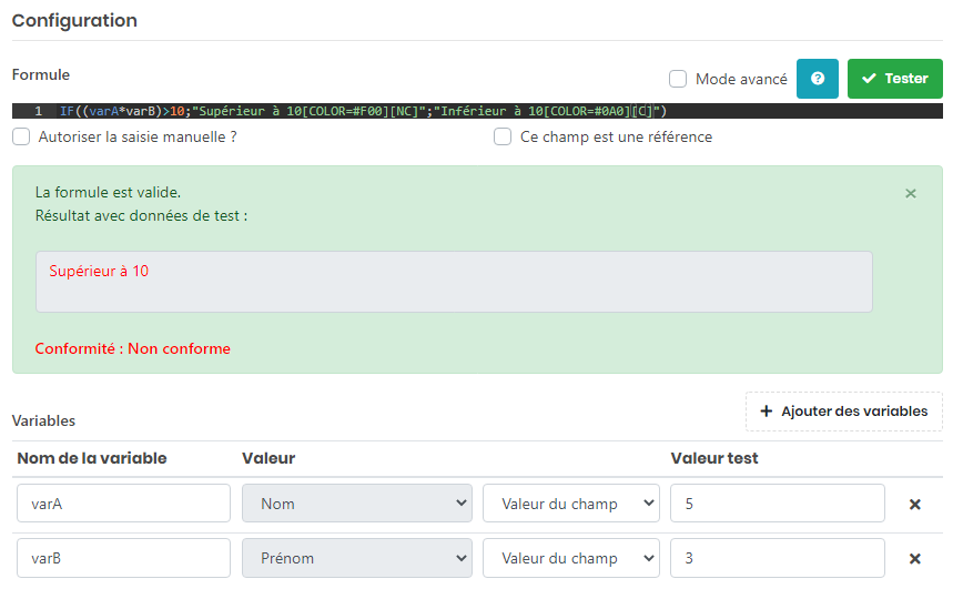 Dans cet exemple on injecte les modifieurs [NC] et [COLOR] qui permettent respectivement de déclenché une non conformité sur le formulaire et d’afficher le résultat de la formule dans une couleur. Par défaut si on ne précise pas la couleur [NC] sera rouge et [C] vert