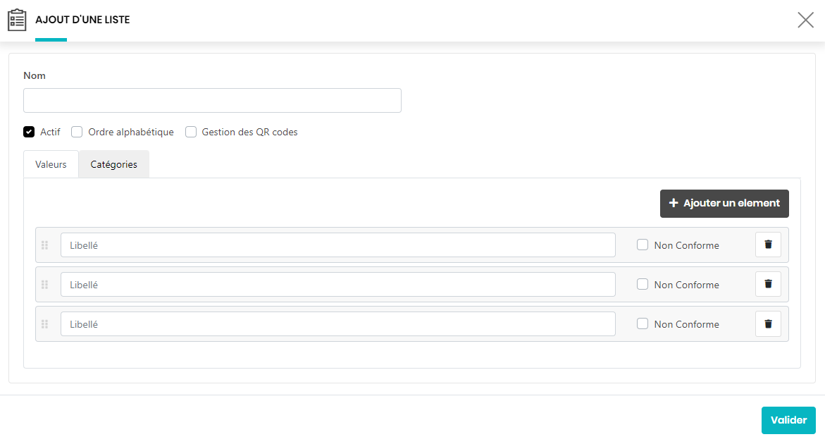 Vous pouvez définir si votre liste est active ou non, si les choix doivent s’afficher par ordre alphabétique et si votre liste doit prendre en gestion les QR codes.