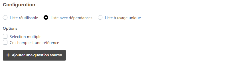 En cochant cette case, vous pouvez choisir que votre liste de choix soit dépendante d’une autre liste de choix de votre modèle. Vous pouvez définir si l’utilisateur est autorisé a choisir plusieurs choix avec la case « Selection multiple » et vous pouvez également choisir si ce champ sera une référence oû non (voir Question référence)