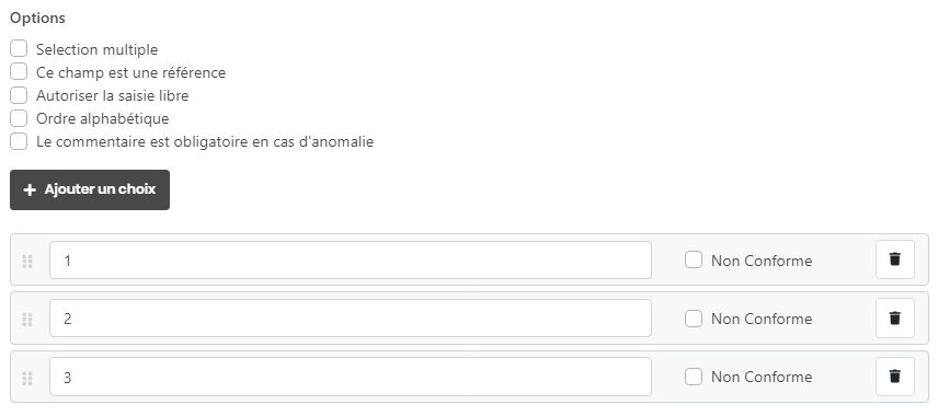 - L’ordre des choix de la liste peut être modifié en faisant glisser les choix verticalement avec la souris à l’aide des poignées à gauche de chaque choix