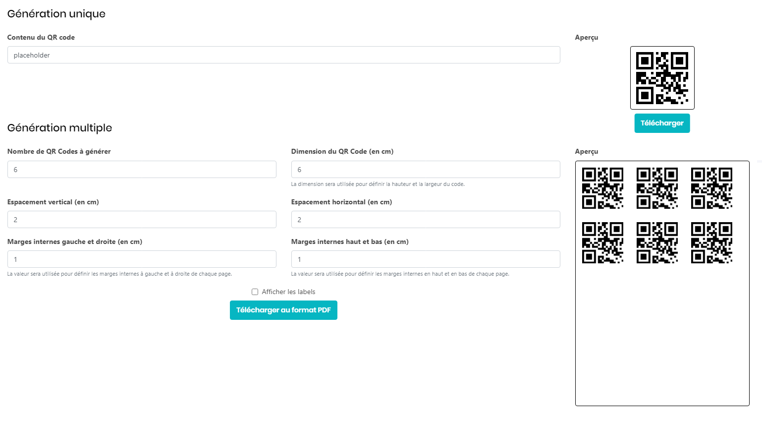 Vous pouvez générer un QRCode unique ou générer un ensemble de QRCode exportable au format PDF, par exemple pour les imprimer sur une feuille à étiquette autocollante.