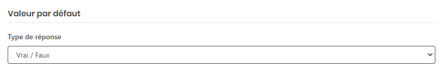 Une question de type vrai/faux permets à l’utilisateur de répondre uniquement par vrai ou faux, ou par oui ou non. Interface administrateur Ici vous pouvez choisir le type de réponse. (Oui/non , Vrai/faux) Le champ si dessous permets de définir la valeur par défaut.